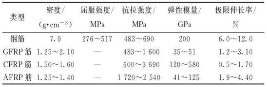在處于惡劣環(huán)境條件時(shí),如干濕交替、化學(xué)介質(zhì)等作用下,普通鋼筋極易發(fā)生腐蝕,嚴(yán)重影響結(jié)構(gòu)的耐久性和適用性,導(dǎo)致結(jié)構(gòu)承載能力的降低。在這種情況下,防腐性能好、黏結(jié)性能與鋼筋相差不多且抗拉強(qiáng)度高的FRP筋成為代替鋼筋的一個(gè)較好選擇(表1)。