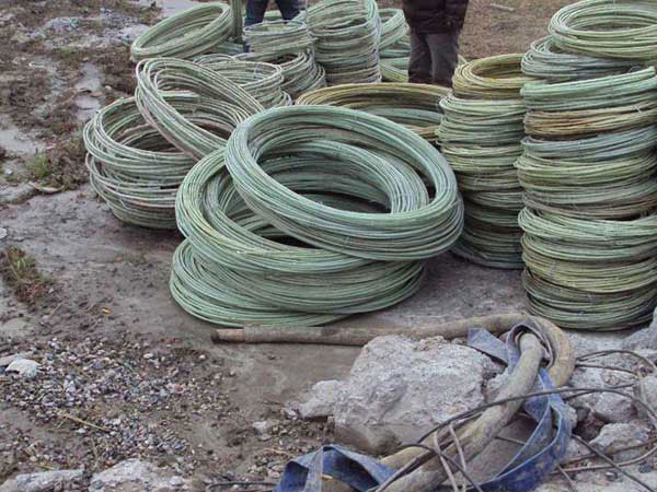3、由于玻璃纖維樹脂筋材在生產時采用的是熱固性樹脂制作,成形之后在施工現場很難改變其形狀,為了保證玻璃纖維鋼筋籠的順利下放,可以利用10#(3.5㎜)鍍鋅鐵線將籠底的玻璃纖維主筋綁扎,起到收口的效果。