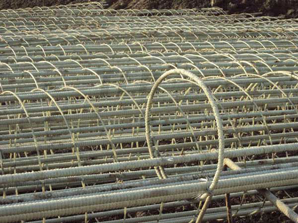 2、普通鋼筋的連接方式眾多,如電弧焊、電渣壓力焊、接駁器、綁扎等等,但玻璃纖維樹脂筋材與鋼筋或者玻璃纖維樹脂筋材與玻璃纖維樹脂筋材之間一般采用的是綁扎方式,用14#(2.2㎜)鍍鋅鐵線進行連接,鐵線的大小可以根據設計要求或者施工現場的加工情況進行調整。綁扎采用的是梅花形布置形式,間距為20㎝,玻璃纖維樹脂筋材與鋼筋的搭接需要按照設計圖紙設置,玻璃纖維樹脂筋材之間的搭接按照40d設置,搭接允許誤差為±100㎜。