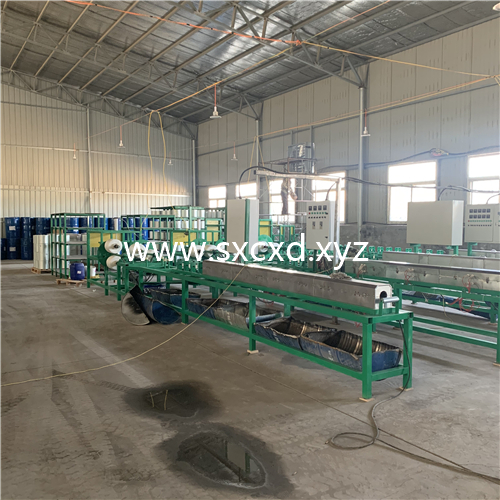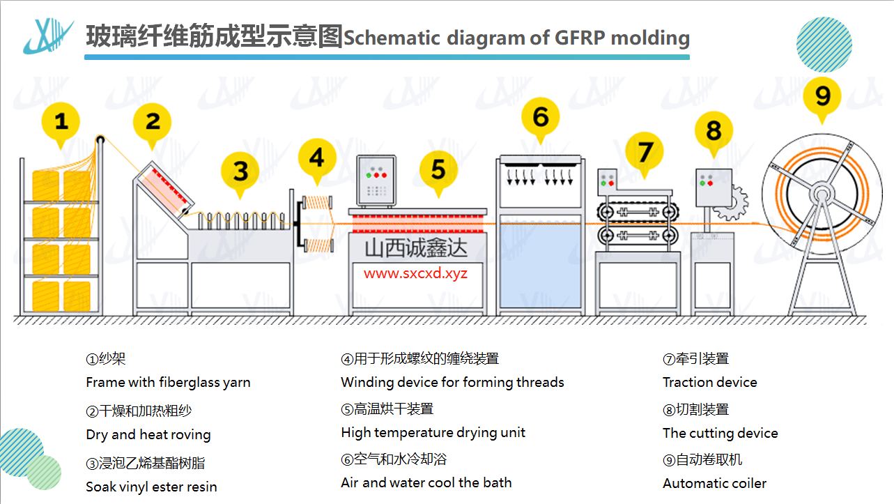 放在紗架上的玻璃纖維紗由于尾部牽引系統的作用,通過過絲板,送到了浸料槽,進料槽內有樹脂,玻璃纖維紗在進料槽內浸滿了樹脂,然后在通過預成型系統合攏成束,在模具內經過加熱器加熱熔融,通過液壓系統擠壓成型,在通過纏繞系統,成為全螺紋玻璃纖維塑料杠體,(在進料槽、預成型系統、纏繞系統前端有硅膠片,作用是保證桿體光滑,無氣泡)然后進入烘干系統進行固化,經過切割組件將桿體切割成所需要的長度,經過品管員的檢驗,入庫。